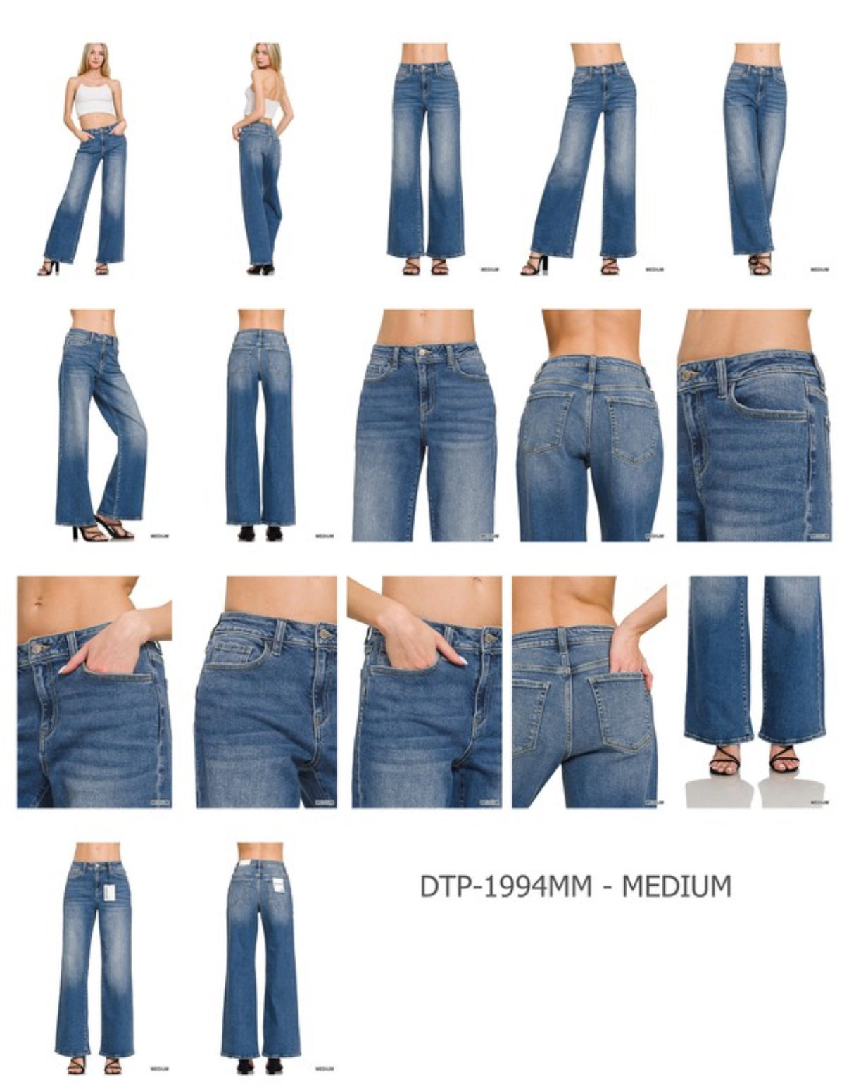 HIGH WAIST STRAIGHT LEG MEDIUM WASH DENIM PANTS - STRETCH DENIM FRONT RISE: 10.25", INSEAM: 31.5" approx. LEG OPENING:23" approx. MODEL IS 5'9" WEARING SIZE 26