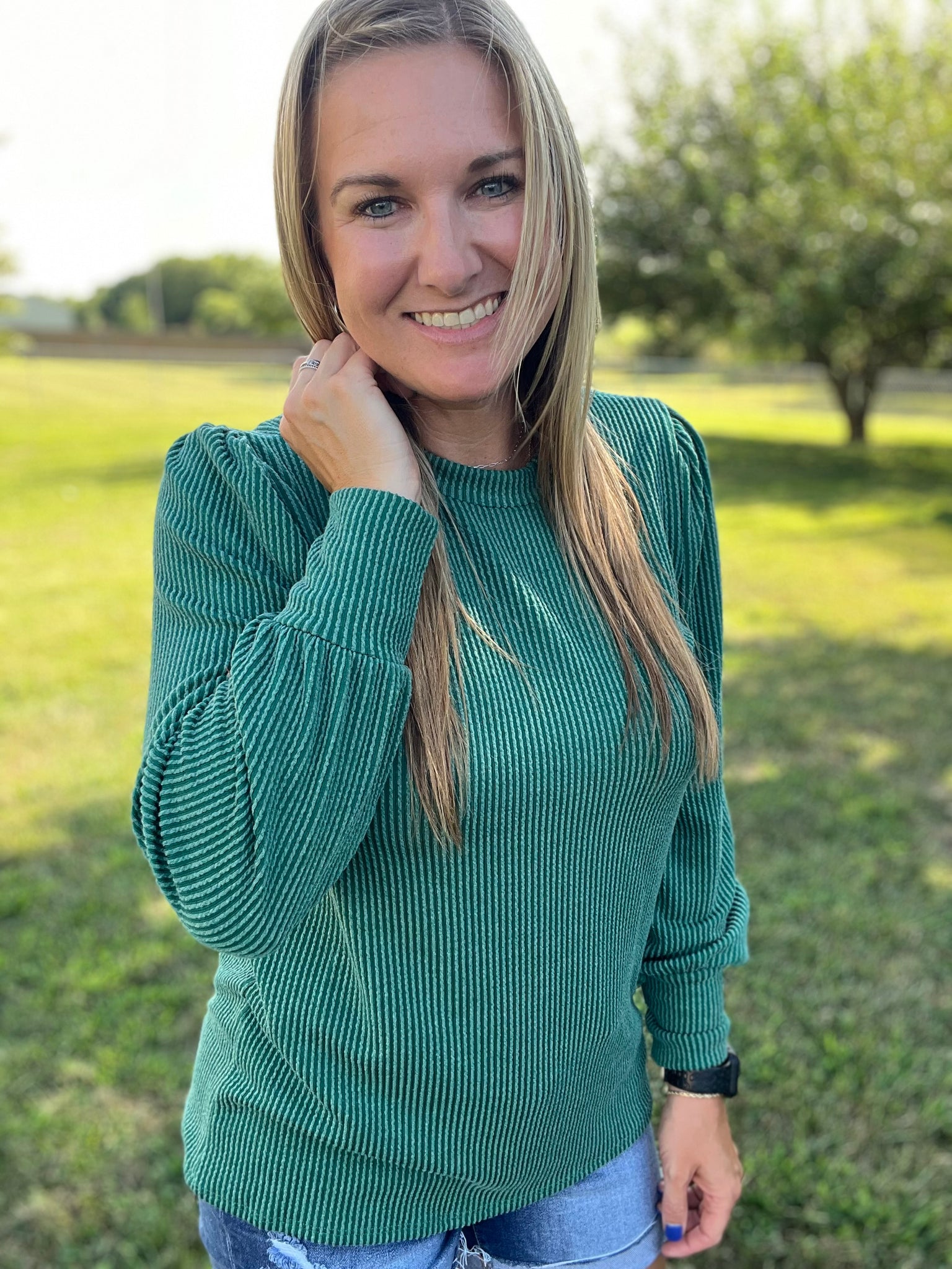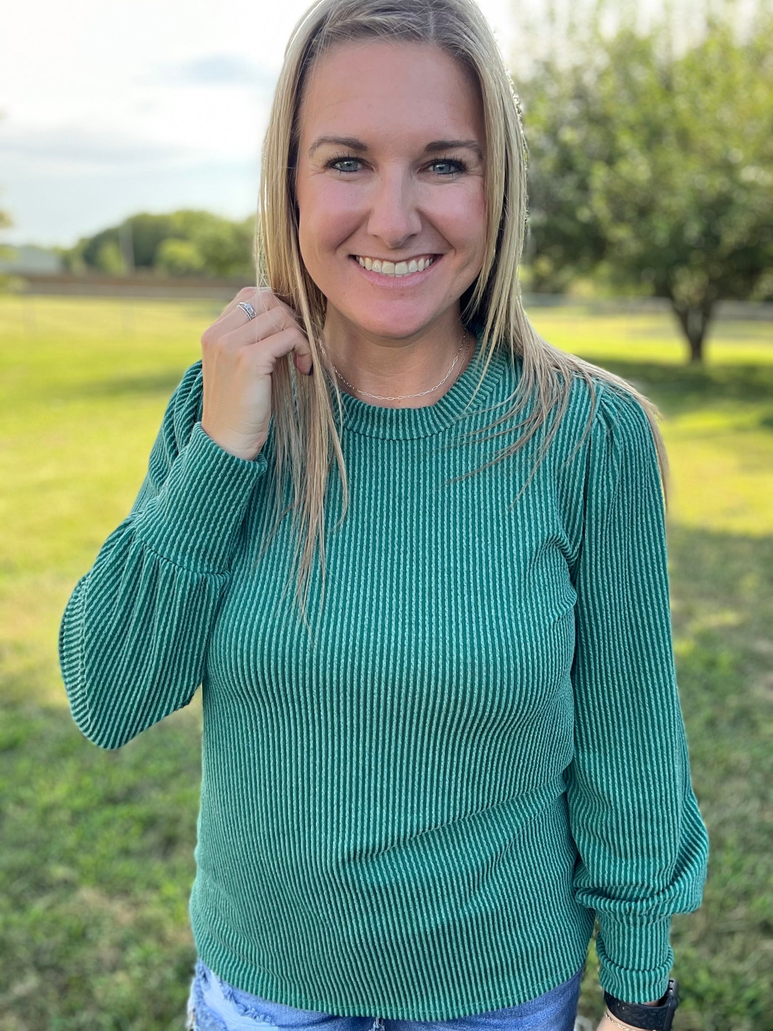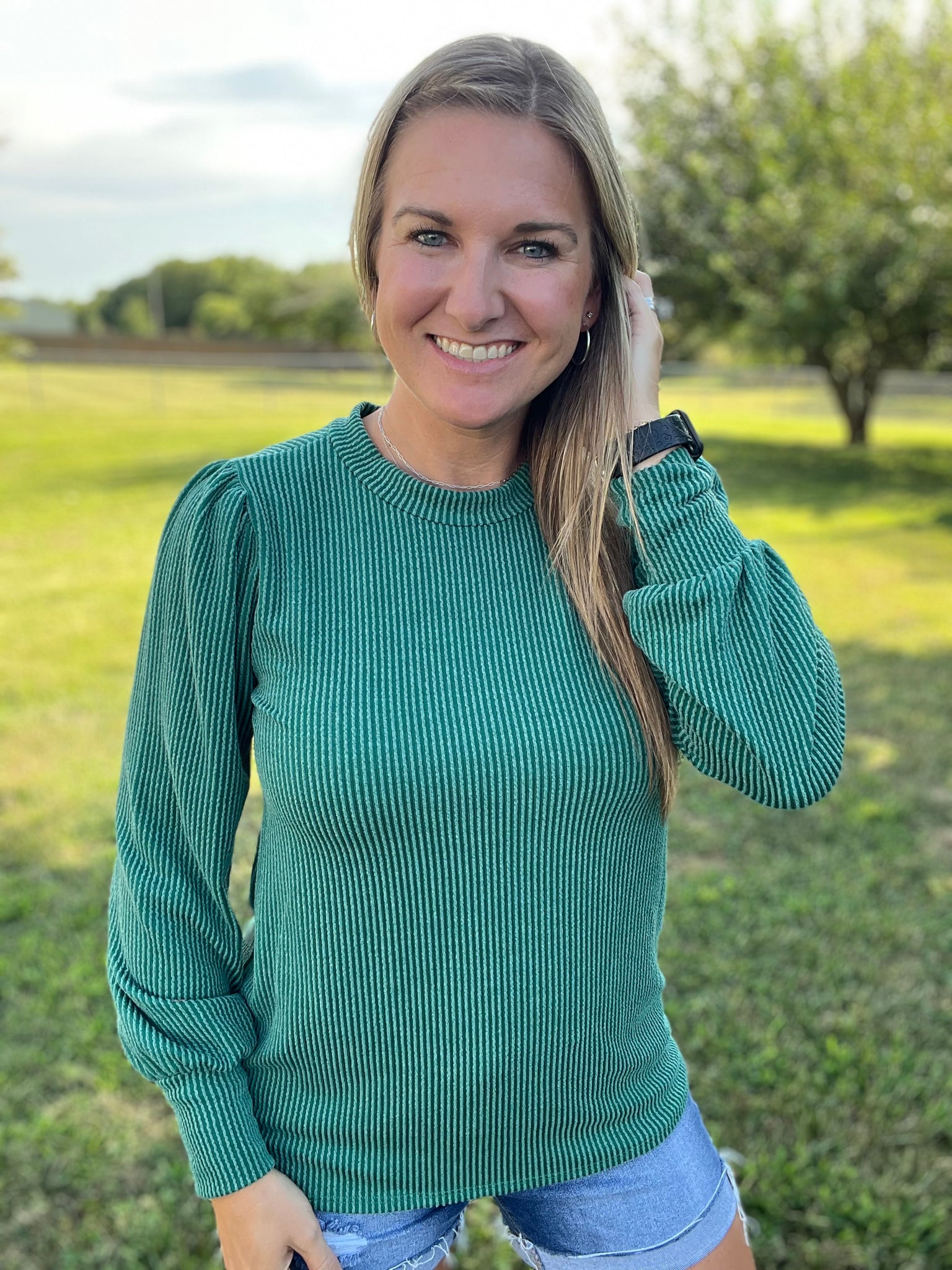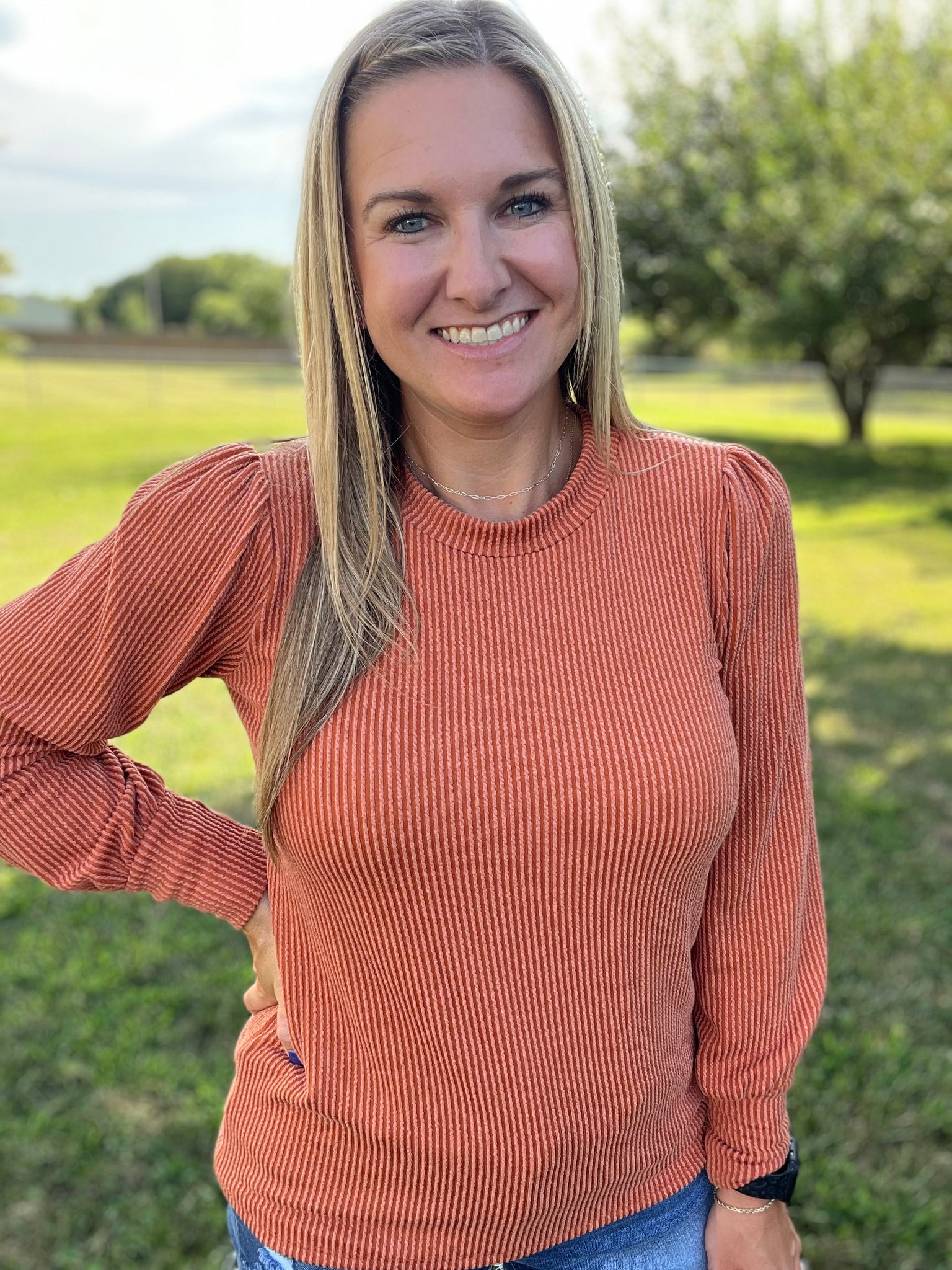 ROUND NECK RUFF LONG SLEEVE JACQUARD TEXTURED MINERAL WASHED RIB KNIT TOP